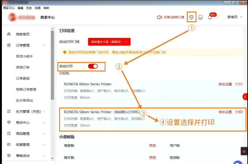 完成打印機與電腦的連接后,還需要將打印機與京東秒送客戶端進行綁定,方可實現外賣訂單的打印。