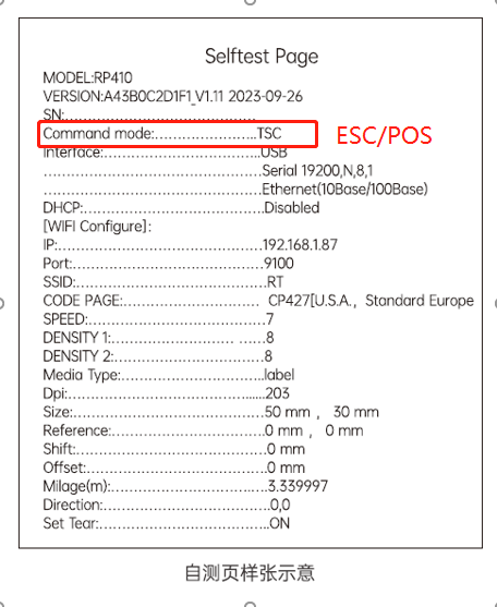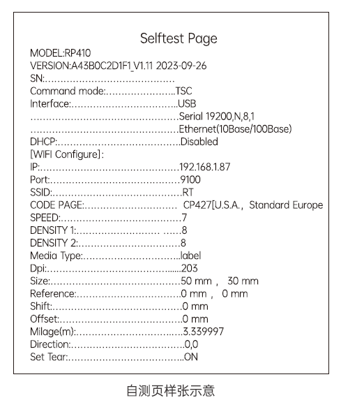 自測頁說明:初次安裝打印機或打印機存在任何問題時可以執行自檢程序,自檢頁內容包含:打印機型號、序列號、固件版本、指令狀態、打印濃度、打印速度及接口信息等;