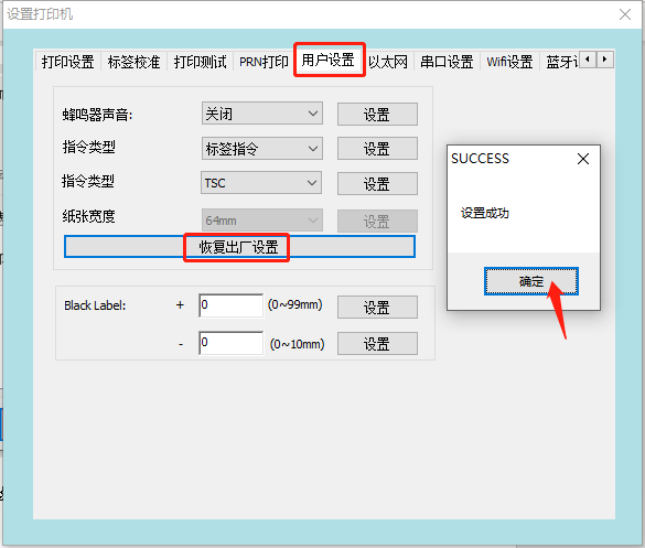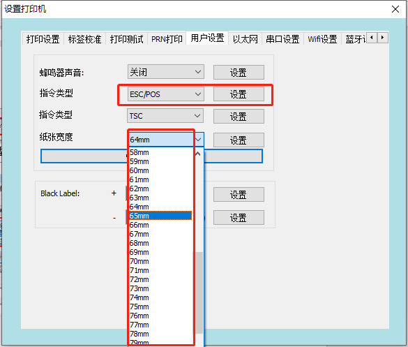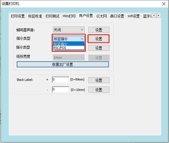 ② 切換“用戶設置”界面在第二行指令類型中選擇“標簽指令”或“ESC/POS”指令,并點擊“設置”;