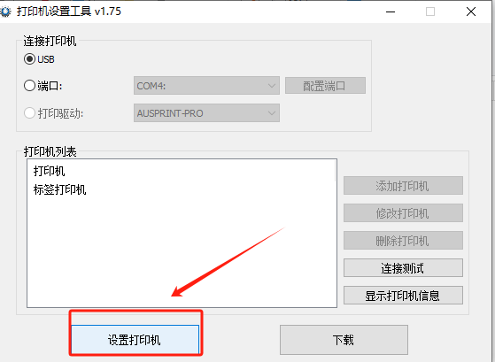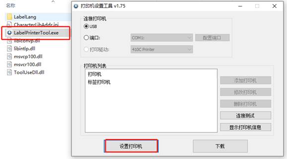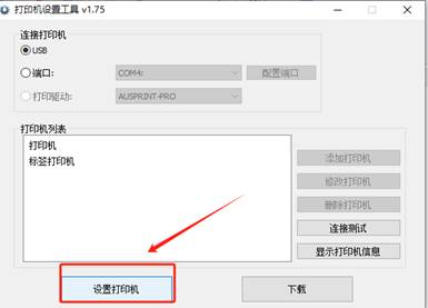 I. 打印機連接USB線,打開標簽設置工具,點擊設置打印機;