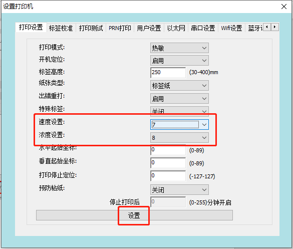 ② 切換到“打印設置”界面,在速度設置/濃度設置選項中分別下拉選擇所需調整的速度和濃度,然后點擊界面最下方的“設置”項,提示“設置成功”或打印機蜂鳴1聲則表示更改設置成功;