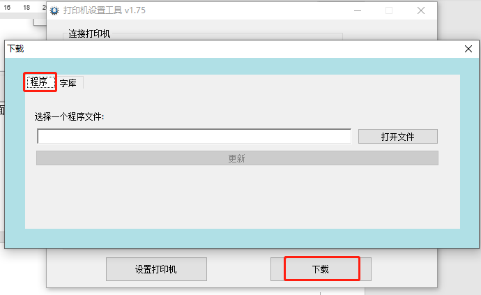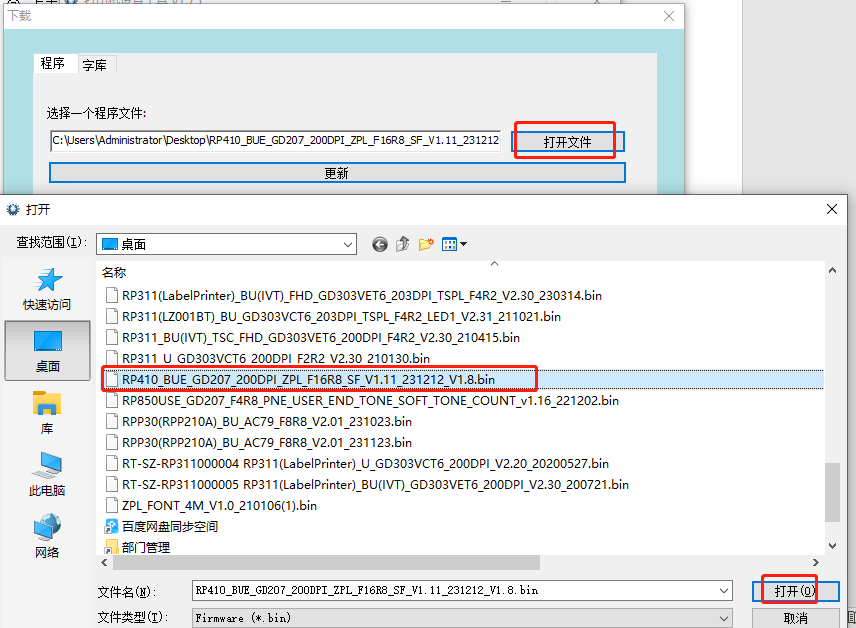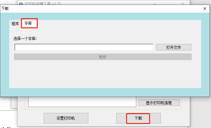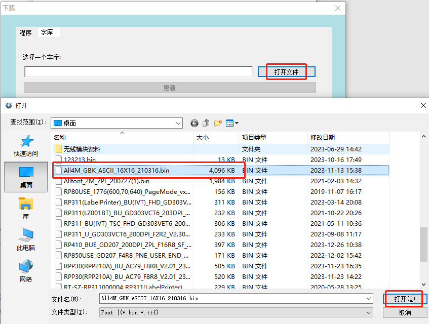 ④ 點擊打開文件,選擇廠家提供的字庫文件,雙擊打印機字庫文件,打開;