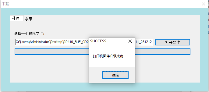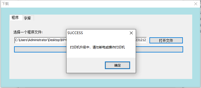 ⑥ 確定之后,開始字庫下載(等待綠色傳輸條跑到最右側)字庫更新之后,通常需要重新開關打印機才能正常生效;