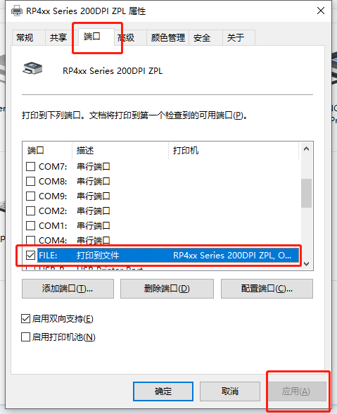 ① 在打開驅動打印機屬性后切換端口,根據實際使用的端口選擇FILE勾選,并保存;