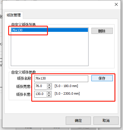 ① 驅動默認有預設尺寸,用戶可通過下拉紙張名稱選擇對應的預設尺寸,點擊確定即可;