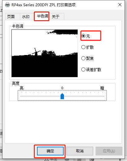① 打開驅動打印機屬性—首選項—切換半色調,選擇無,亮度0,確認進行調整;