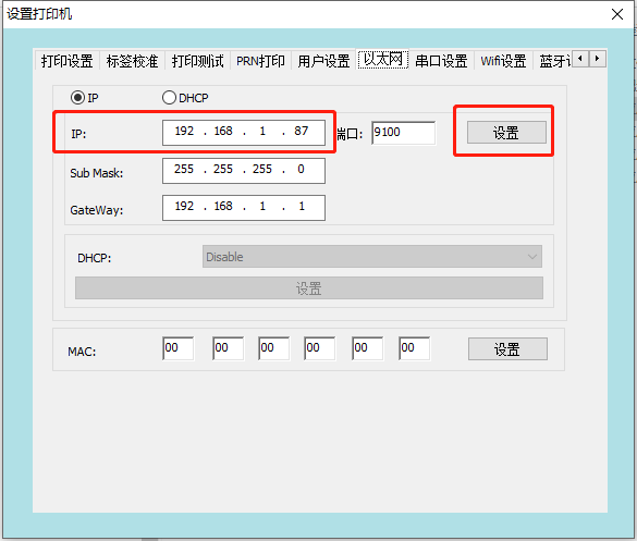 局域網網口打印時,需先對每臺打印機進行IP地址設置,保證打印機與主機的IP地址處于相同的網關: