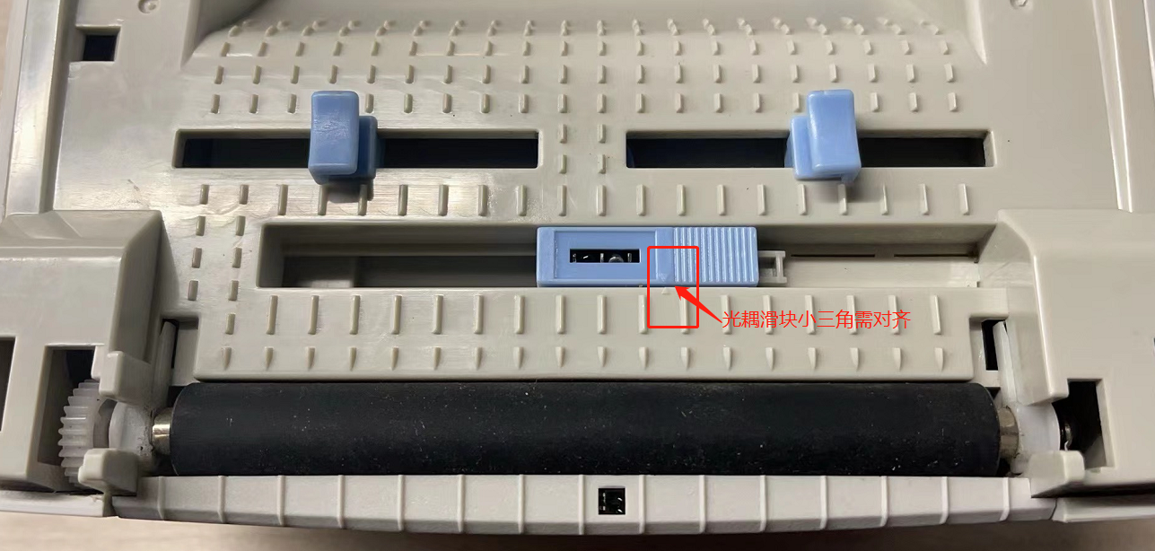 容大RP310/RP410系列光耦滑塊設計為可滑動,若是標簽打印時,需把光耦滑塊上的小三角形與支架上的小三角形對齊,如下圖