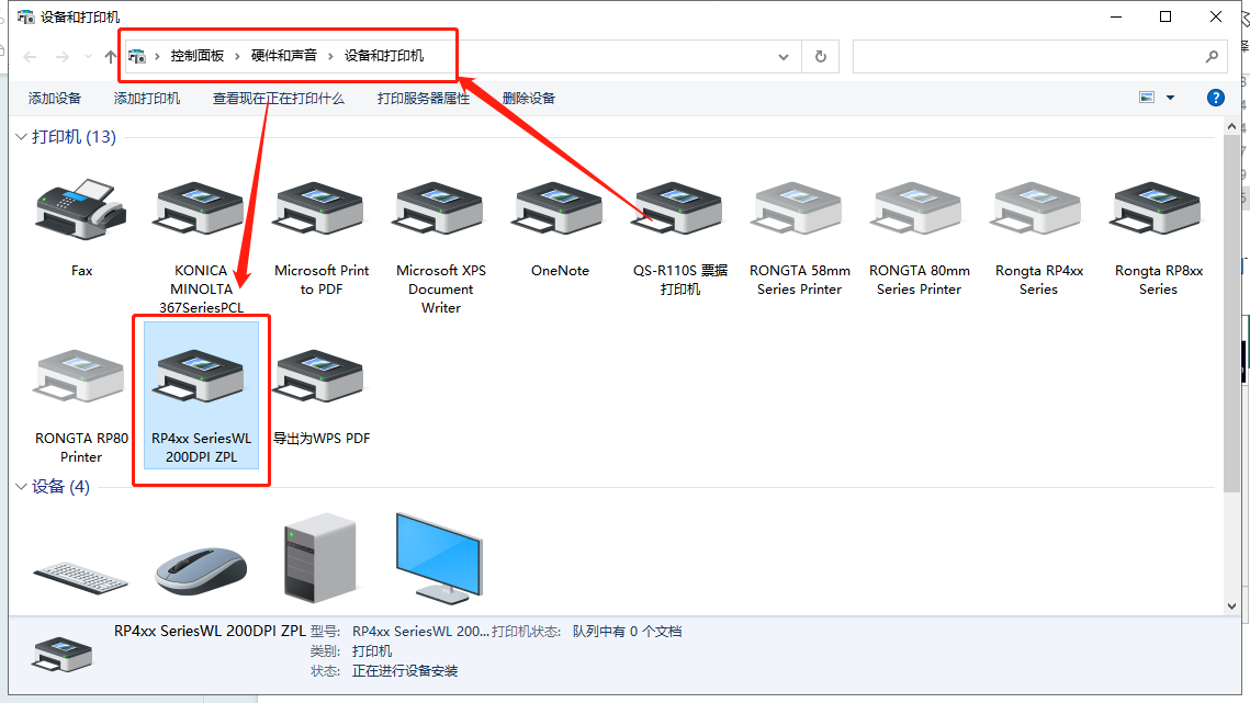 6.1打開“控制面板”,找到“設(shè)備和打印機”,右鍵安裝好的打印機驅(qū)動(RP4xx Series WL 200DPI ZPL):