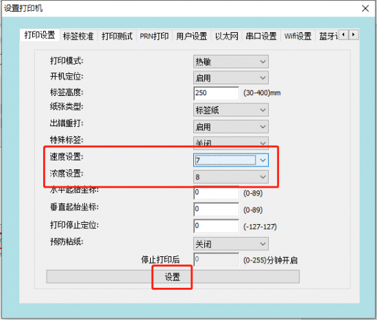 b.切換到【打印設置】界面,在速度設置/濃度設置選項中分別下拉選擇所需調整的速度和濃度,然后點擊界面最下方的“設置”項,提示【設置成功】或打印機蜂鳴1聲則表示更改設置成功。