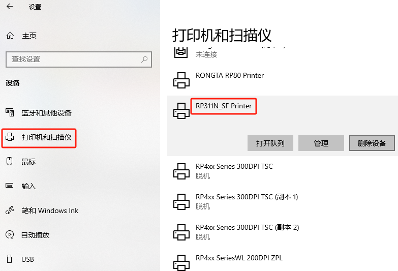 c.驅動安裝完成后可在電腦左下角Windows鍵點進去→設置→設備→打印機和掃描儀,查看是否識別出“RP311N_SF Printer”的打印機名稱,如有顯示則在打印軟件上選擇此打印機進行打印,如未顯示可重啟電腦后再查看。