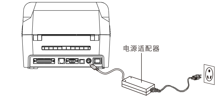 確認(rèn)打印機(jī)電源開關(guān)處于關(guān)機(jī)(O)狀態(tài),將電源適配器連接到打印機(jī),將電源線連接到電源適配器,將電源線另一端連接到附近的插座。