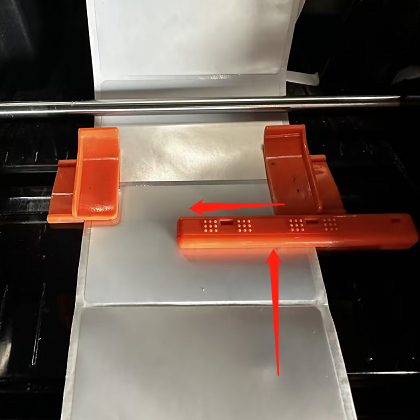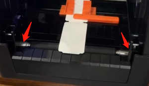 按下打印頭開關(guān),開啟打印頭。將紙張前端拉出(打印面朝上),穿過壓紙軸、紙寬調(diào)節(jié)導(dǎo)紙塊、對(duì)射定位光耦組后,調(diào)整合適位置。