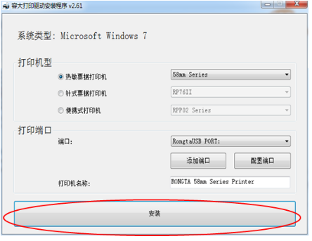 選擇對應的“型號”、“端口”,再點擊安裝。選擇58mm series型號,端口號根據實際端口號。