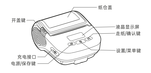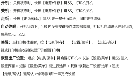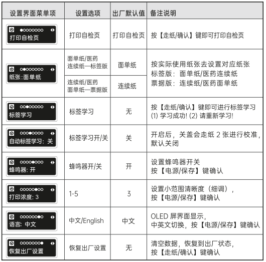短按【電源/保存鍵】喚醒打印機 → 長按【設置/菜單鍵】3S 進入設置界面 → 短按【設置/菜單鍵】進行選擇 → 切換對應的菜單界面,并配合【電源/保存鍵】、【走紙/確認鍵】進行切換和確認;