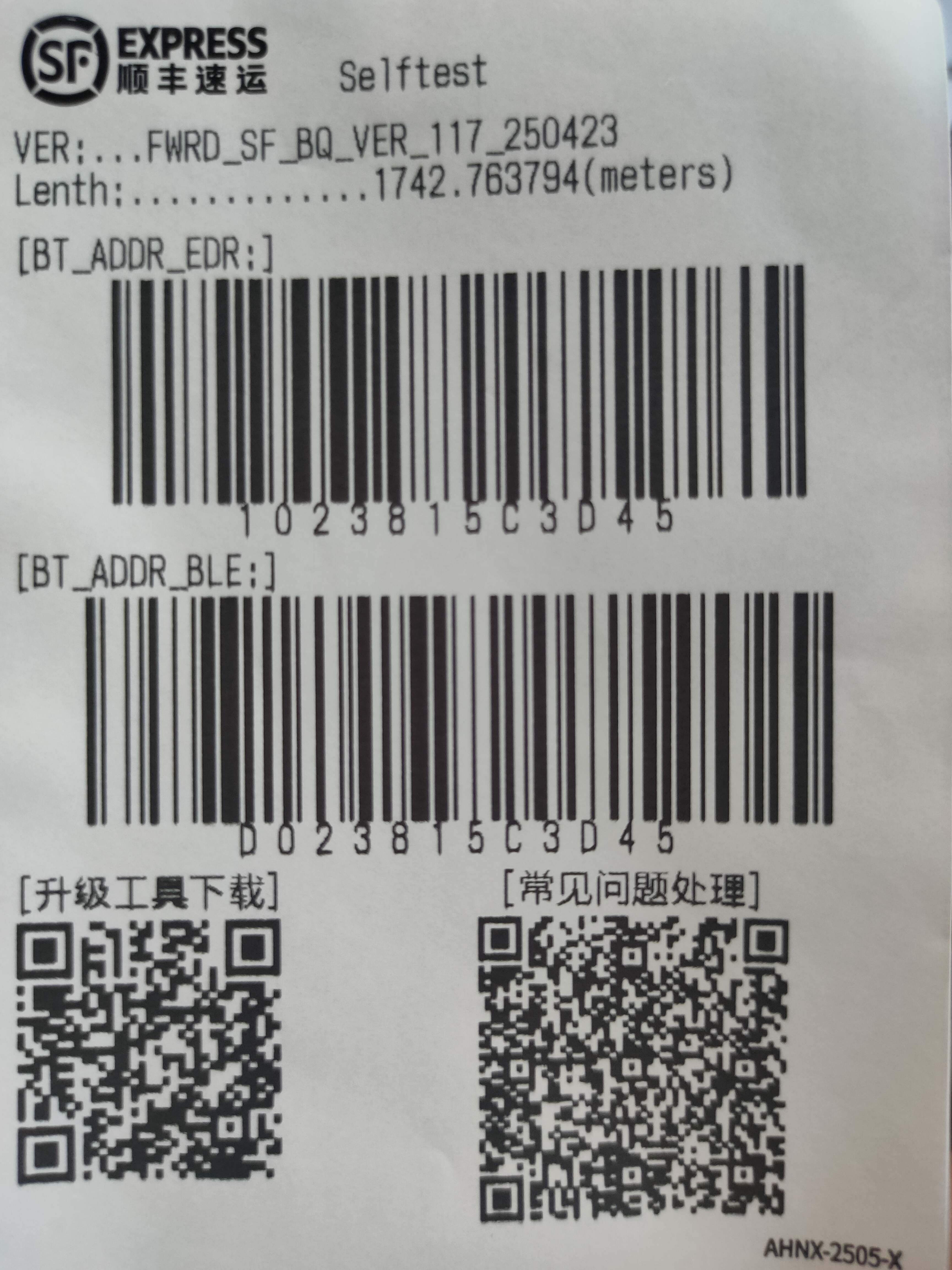 長按【設置/菜單鍵】切換到“打印自檢頁”界面,再短按【走紙/確認鍵】即可打印出自檢頁;通過自檢頁查看打印機固件版本、打印里程(米)、藍牙連接一維碼、藍牙MAC地址信息。