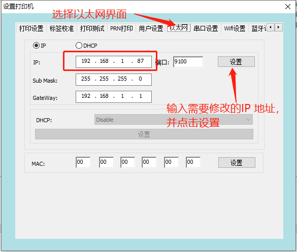E、 如果以上步驟均無法正常獲取到IP 地址,可以嘗試使用USB線連接windows 電腦,使用標簽設置工具進行固定IP 設定