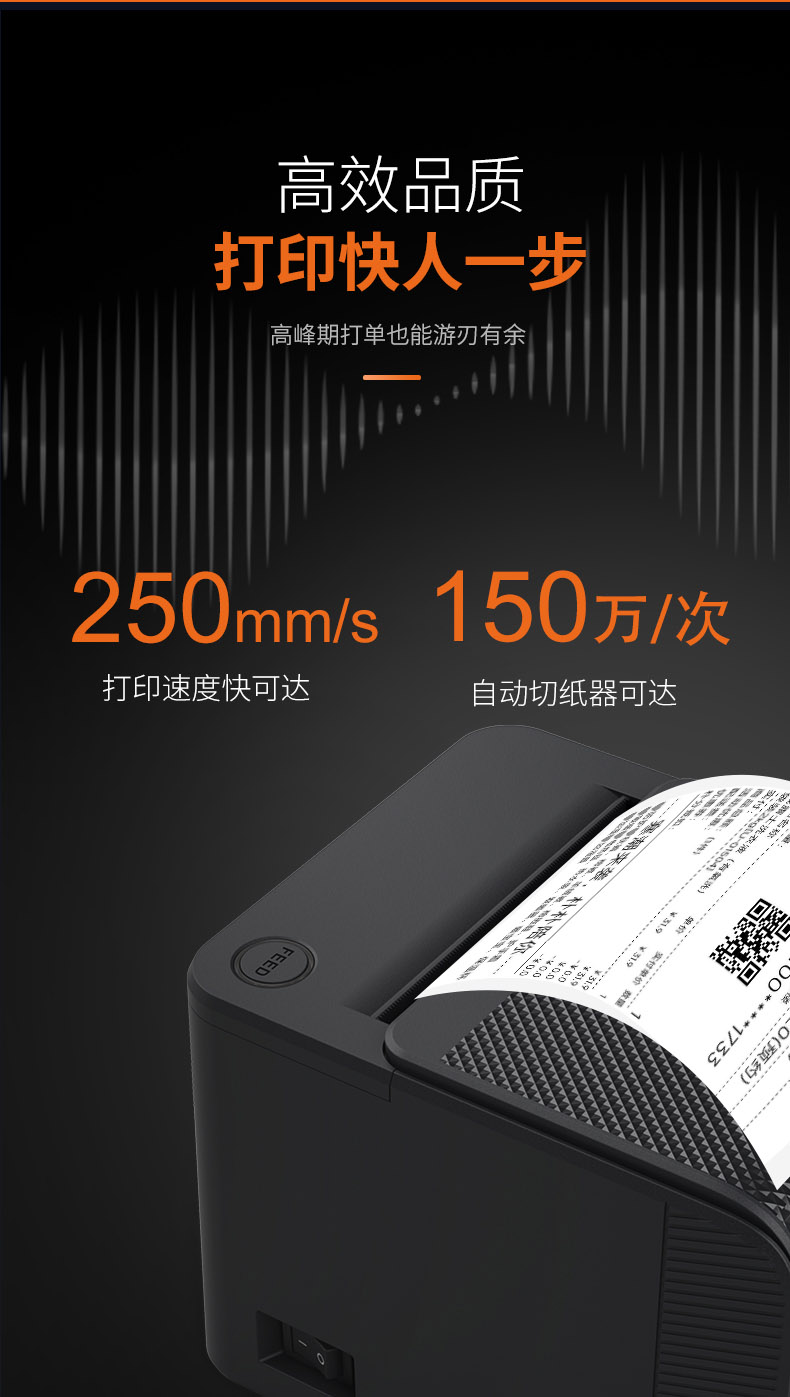 250mm/s高速打印,輕松應對爆單 支持平放、壁掛,靈活安裝,適應不同場景需求 兼容性高,耐用可靠,持久穩定