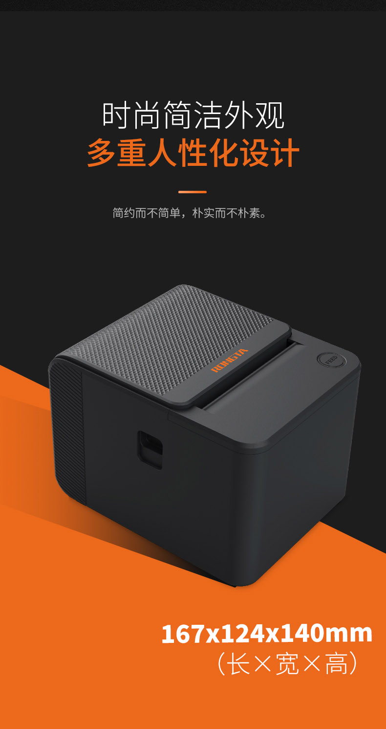 1. 外觀時尚,高端配置,超高性價比 2. 易裝紙結構設計,支持多種接口 3. 自動切紙,來單提醒,不漏單 4. 80mm大紙倉,兼容58紙卷 5. 250mm/s 高速打印