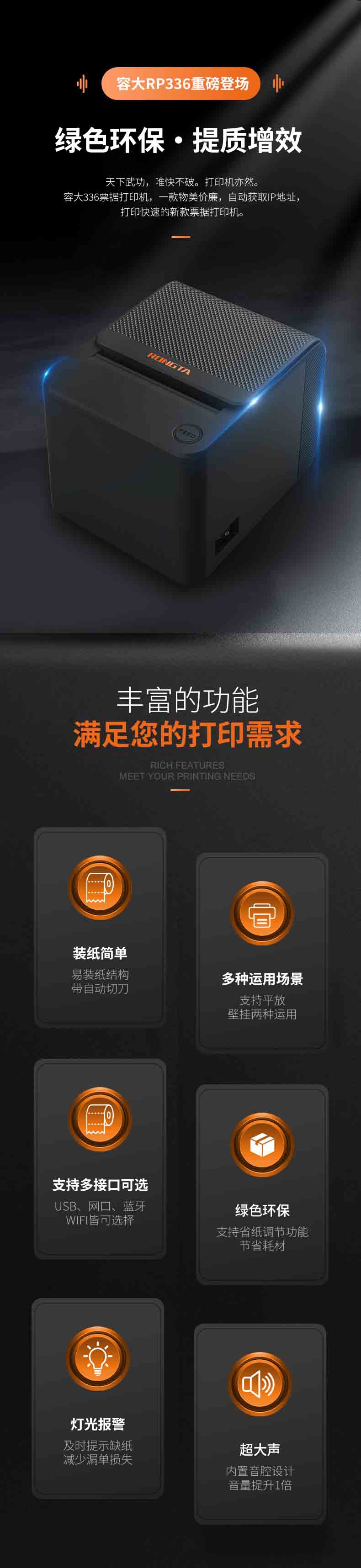 1. 機身小巧,外觀時尚 2. 支持頁邊距、行間距調整 3. 250mm/s 高速打印 4. 支持人聲警報功能、NFC功能 5. 前出紙上出紙隨心切換